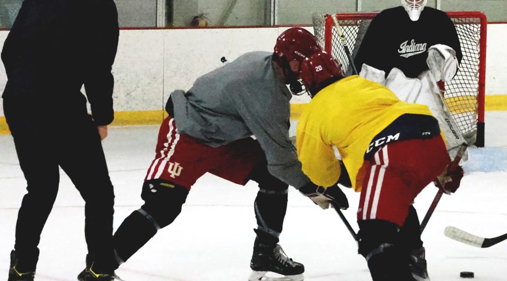 Burke pauses between drills during club hockey practice. The Newton, Massachusetts native has brought his lifelong love for the game to Bloomington.