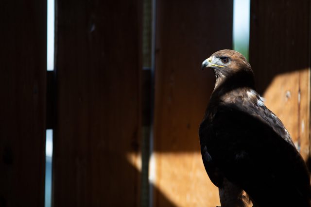 The picture above reflects one of my more recent uses of the concept. On my first day working at the Yakama Nation Aviary, I struggled with the light in the enclosures. I knew I would need to work on isolating my subjects against a difficult lighting and background. To make this image, I arrived promptly at 6am for the morning routine with the animals and stood outside the enclosure door. I exposed just for the light that was shining through the door and hitting the back wall. Then I waited. At one point Hera flew into the ray of light and I was ready. It took several shots to get one where her face was in well placed in a ray, but it was worth the wait.